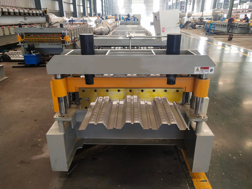 Metal Zemin Güverte Çelik Rulo Şekillendirme Makinesi Hidrolik Kesim. Yüksek gerilimli zemin zemin kaplaması çelik rulo şekillendirme makinesi tarafından üretilen zemin güverte paneli, yüksek perdeleri ve güçlü mukavemeti nedeniyle inşaat binasında yaygın olarak kullanılmaktadır. Manuel açıcı, ana rulo şekillendirme makinesi ( güvenlik görevlisi isteğe bağlı), Hidrolik kesme sistemi, PLC kontrol sistemi, çıkış tablosu.